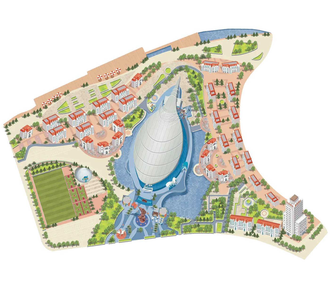以巨型白色核心建筑为视觉中心,周边建筑呈半环绕式布局,形成强烈的主次关系,凸显地标性与画面秩序感。弱化路径,强调“场景”