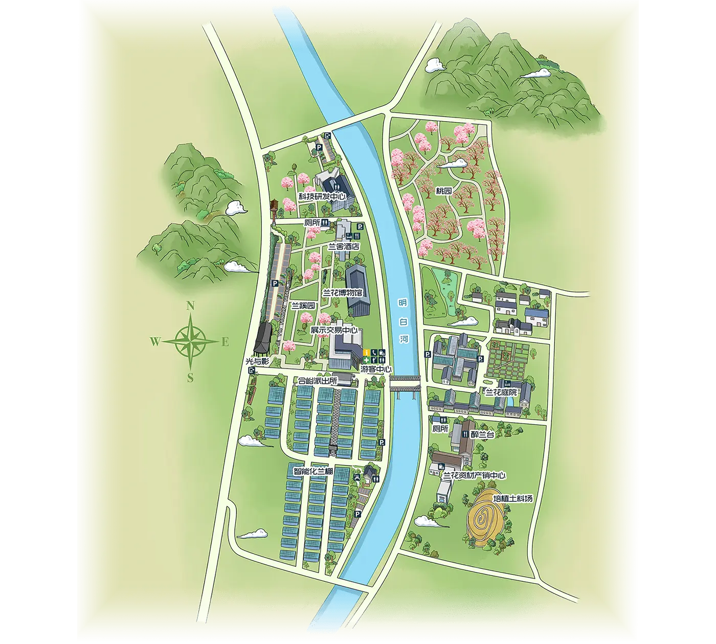 道路系统、建筑群绘制得非常规整,线条平直,突出了园区的现代化和科技感。远处的山峦采用了水墨画的晕染处理,桃树和绿植则采用了图章式的重复排列,增添了艺术气息。产业链条的完整展示