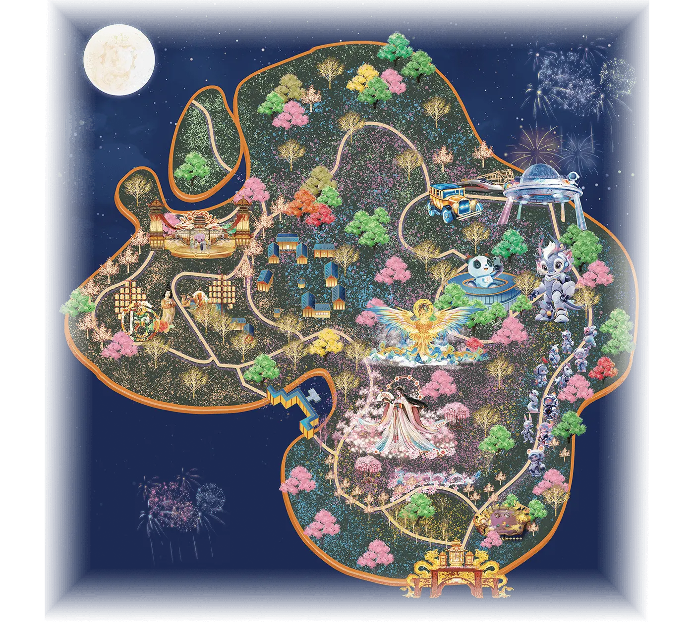 大量采用了中国传统文化符号,如古装舞者、凤凰、熊猫、古代阙楼和灯笼。同时搭配类似UFO或太空舱的装置,这种古今穿越、虚实结合的混搭,制造了强烈的视觉张力,暗示景区包含多元化的主题体验。情绪价值的营销