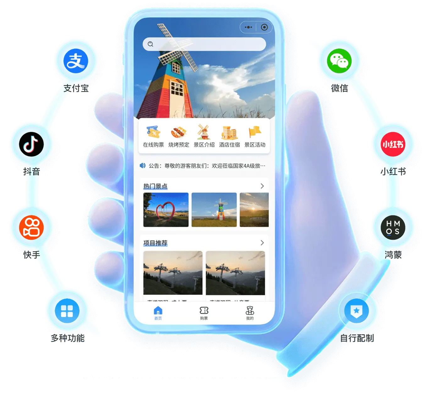 系统提供全面数据分析,并支持接入第三方OTA渠道,为景区运营决策和营销推广提供支持。一次部署,6端展示